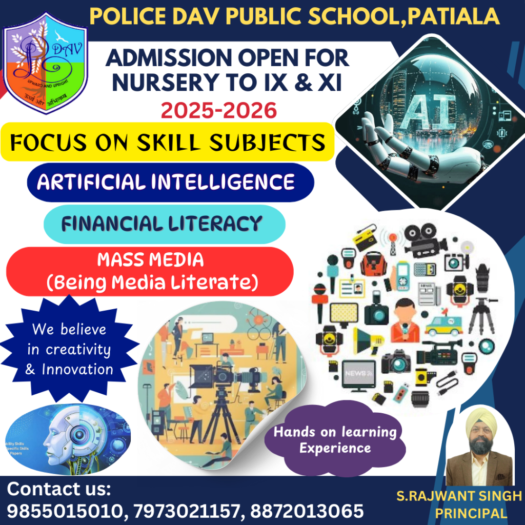 In a significant step towards holistic education Police DAV Public School Patiala is proud to introduce skill-based subjects as part of its curriculum. This initiative aims to equip students with practical knowledge and industry-relevant skills, preparing them for future careers and higher education. The newly introduced subjects includes Artificial Intelligence, Financial Literacy and Mass Media, which will help students develop critical thinking, problem-solving abilities, and hands-on expertise. These subjects align with the National Education Policy (NEP) and emphasize experiential learning to bridge the gap between academics and real-world applications.